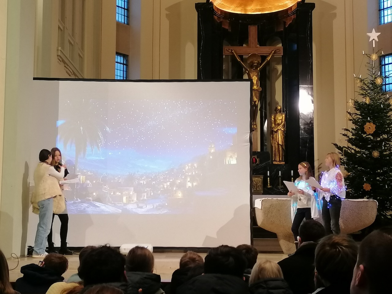 Es ist eine besondere Stimmung kurz vor den Weihnachtsferien: Morgens ist die ganze Schulgemeinde in die wunderschöne Bonifatiuskirche eingeladen, um einen von Schülerinnen und Schülern mitgestalteten Weihnachtsgottesdienst zu erleben. Inhaltlich wird dies von der Fachschaft Religion, insbesondere Herrn Koch, organisiert. Die Fachschaft Musik unterstützt den Gottesdienst mit weihnachtlicher Musik. Herzlichen Dank an alle Beteiligten für diese Einstimmung in die Weihnachtszeit!