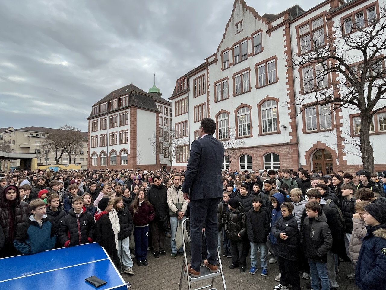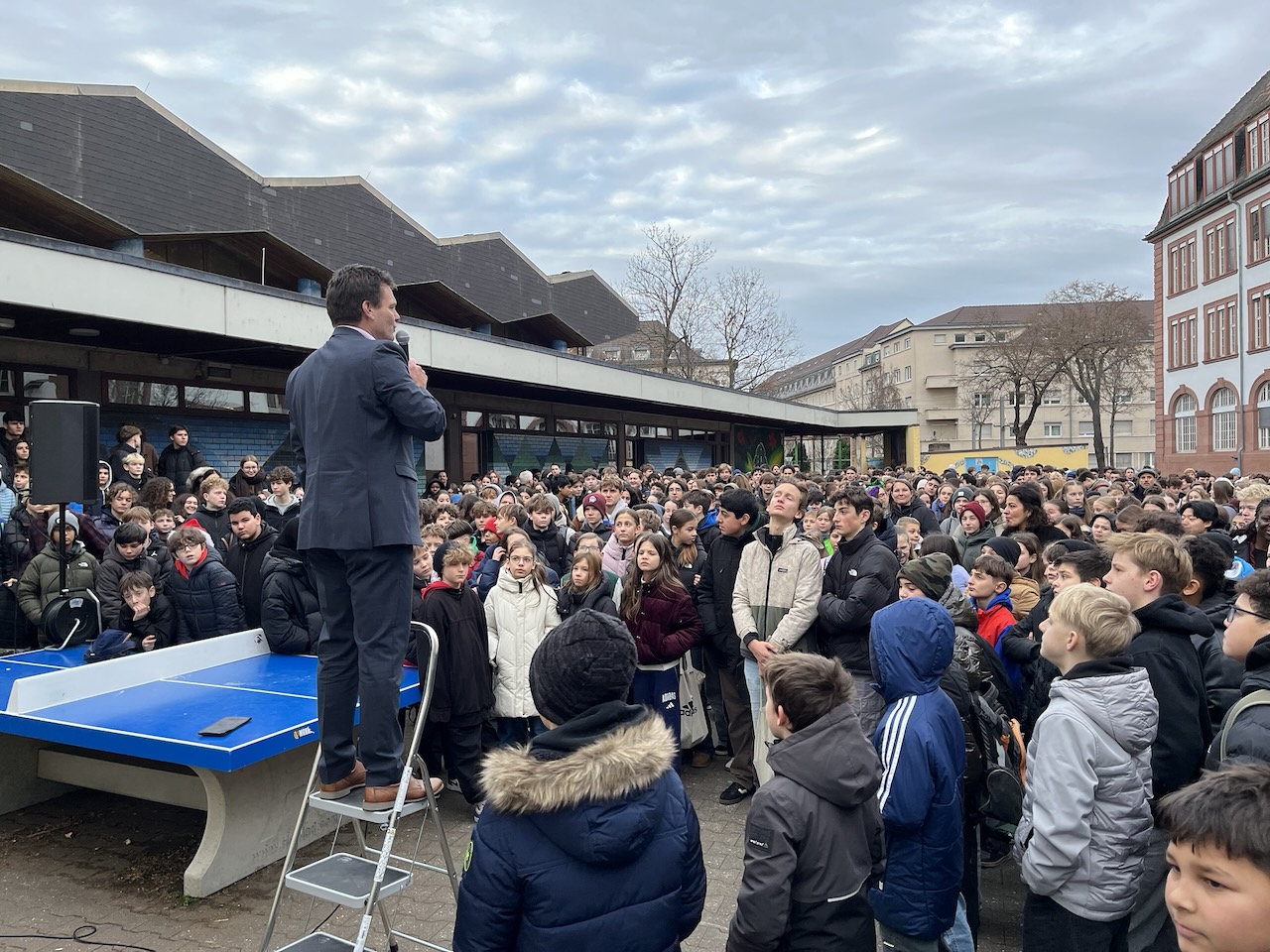 Die Vollversammlung im Schulhof gibt Schulleiter Stefan Weirether die Möglichkeit, mit persönlichen Worten die Schülerinnen und Schüler in die Weihnachtsferien zu entlassen.