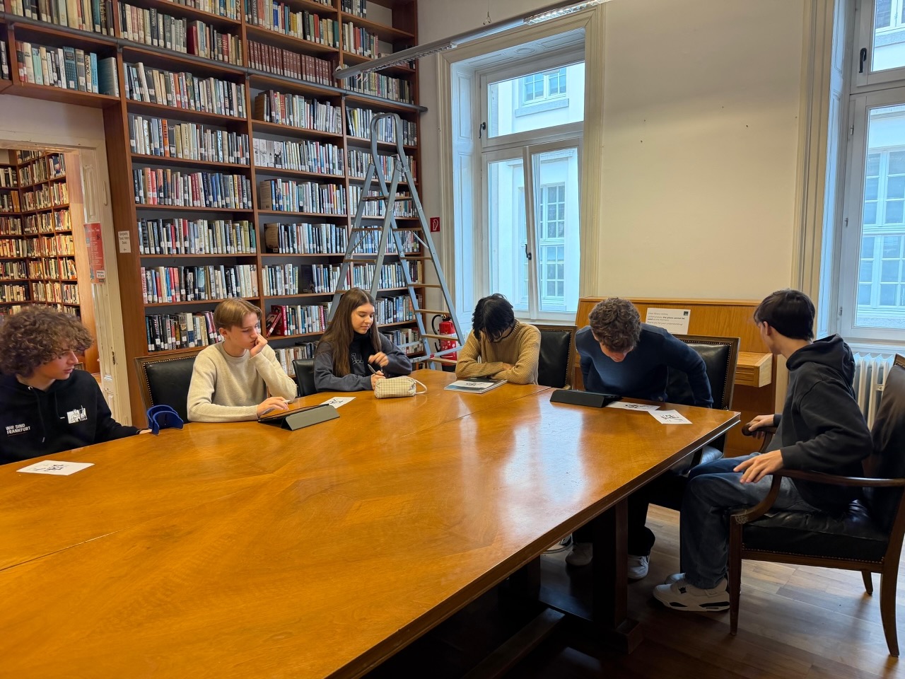 Während der Arbeitsphasen bot die besondere Atmosphäre der Bibliothek mit ihrer vielfältigen englischsprachigen Literatur – von zeitgenössischen Romanen über politische Magazine bis hin zu kultur- und gesellschaftsbezogenen Sachbüchern – einen inspirierenden Rahmen, der Motivation förderte und neue Denkanstöße ermöglichte.