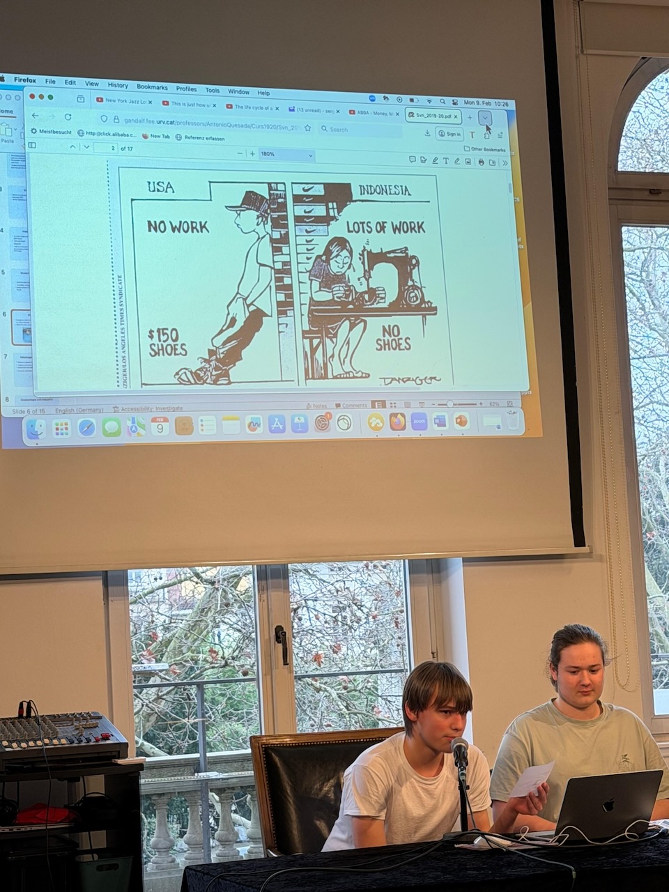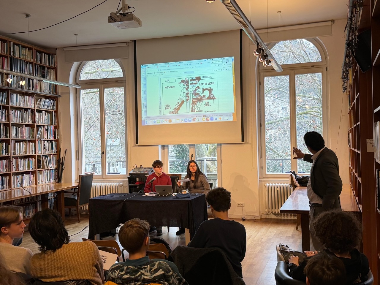 Geleitet wurde der interaktive Workshop von Sergio Mukherjee, einem Sozialwissenschaftler mit Promotion in Politikwissenschaft an der University of Pennsylvania. In Gruppen- und Partnerarbeit diskutierten die Schülerinnen und Schüler Zitate, analysierten Karikaturen und erarbeiteten unterschiedliche Perspektiven auf das Thema. Ein alltagsnahes und zugleich anschauliches Beispiel half dabei, die theoretischen Inhalte zu konkretisieren: Woher kommt eigentlich das T-Shirt, das wir tragen? Wo wird es produziert? Welche einzelnen Schritte sind notwendig, bis es schließlich in unseren Händen landet?